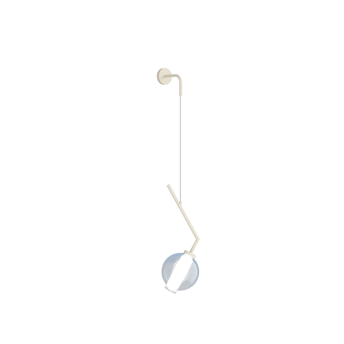 Lampada da parete dall’ aspetto dinamico ed originale che si presenta con una struttura geometrica, caratterizzata da linee spezzate e angolazioni nette, realizzata in metallo di colore Nero oppure Sabbia (a vostra scelta) e sostiene con equilibrio un affascinante corpo illuminante in vetro soffiato borosilicato (Pyrex) dall’effetto visivo ricercato e moderno. Il diffusore è composto da una sfera esterna in vetro dal diametro di 22 cm proposta in sei varianti cromatiche: Ambra, Bronzo, Blu, Fumè, Trasparente e Verde, per offrire ampia libertà di personalizzazione e da un cilindro interno satinato, dotato di filettatura, per agevolare lo smontaggio e la manutenzione della lampada.