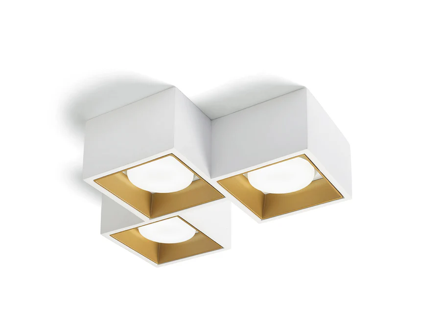 Plafoniera cubo dalla forma quadrata, con un design moderno e lineare, con la struttura realizzata in gesso con affascinante elemento decorativo interno in alluminio disponibile in 5 diversi colori, a scelta, tra Bianco, Nero, Bronzo, Rame e Ottone spazzolato. Le sue forme pulite e le diverse combinazioni cromatiche la rendono una soluzione d’illuminazione versatile e adatta a qualsiasi contesto.