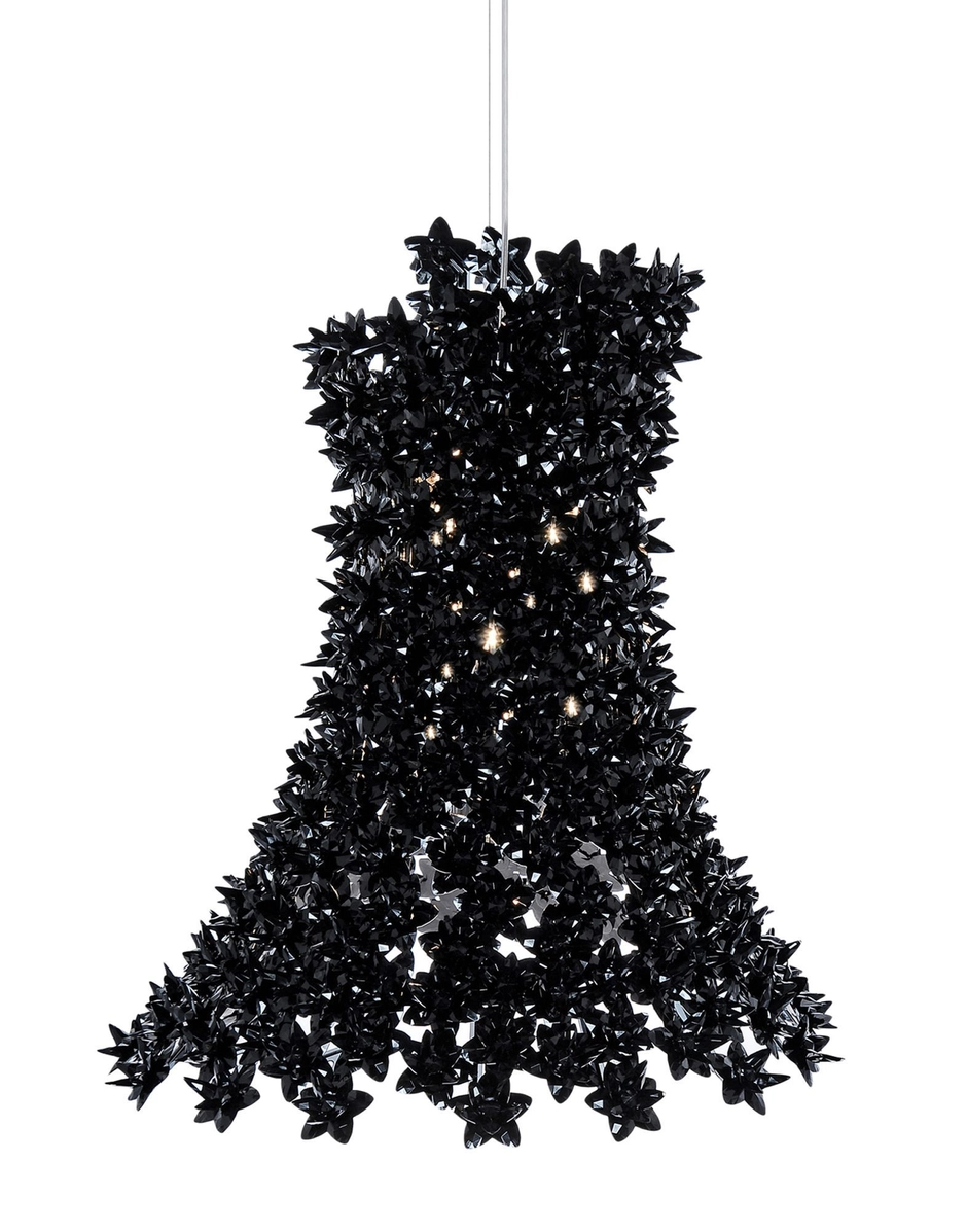 Bloom è composta da uno scheletro tubolare in policarbonato interamente ricoperto da una struttura composta da piccoli fiori a doppia corolla. Il risultato è una lampada a produzione industriale ma con le forme e la complessità stilistica di un pezzo unico, artigianale. Una serie di lampadine posizionate sullo scheletro interno diffondono il fascio luminoso attraverso i petali, rifrangendosi sulle loro superfici sfaccettate sprigionando mille riflessi.