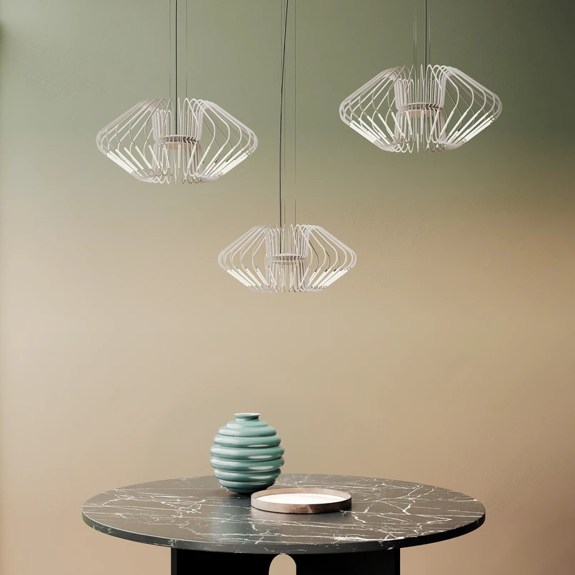 Lampada sospensione in metallo con bacchette tagliate laser e verniciate disponibile in colore Cipria Opaco o Titanio. Rosone in tinta. Disponibile in quattro misure. Cavo di alimentazione altezza cm.200. I moduli LED si illuminano tramite contatto con metallo. Alimentatore a bordo.