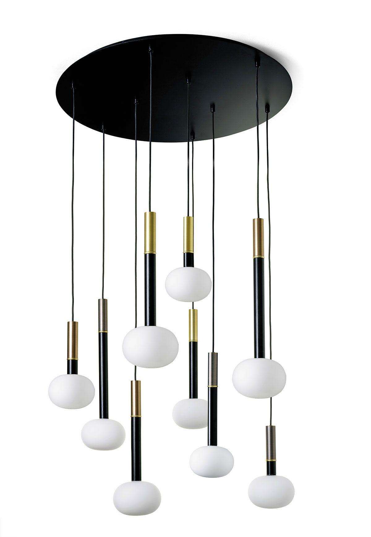Lampada a sospensione in vetro soffiato bianco latte. Montatura in metallo verniciato nero soft-touch, con particolari in ottone spazzolato, rame spazzolato e bronzo spazzolato. Attacco lampadina G9 LED 10W- 3000k 4000k