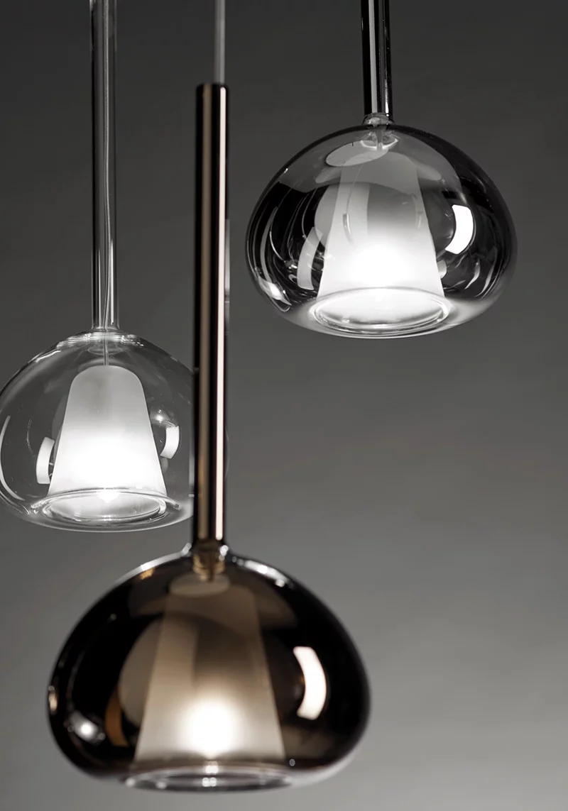 L’accattivante lampada multifunzionale BEBA LED. Si tratta di una scultura luminosa , adatta e utilizzabile anche come lampada di design per la massima versatilità. La lampada a sospensione a LED BEBA offre una vista affascinante, che è un accessorio di illuminazione decorativa per un concetto di vita moderno. Il creator si è ispirato ai pistoni a vuoto per questo insolito design della tonalità. I preziosi vetri sono stati formati in tonalità a doppia parete, che sono anche caratterizzati dai loro colori brillanti che danno alla luce emessa un luccichio speciale. Vetro borosilicato soffiato in quattro colori: trasparente, oro, cromo e bronzo. Montatura con kit rosone bianco da una unica calata verniciati bianco.