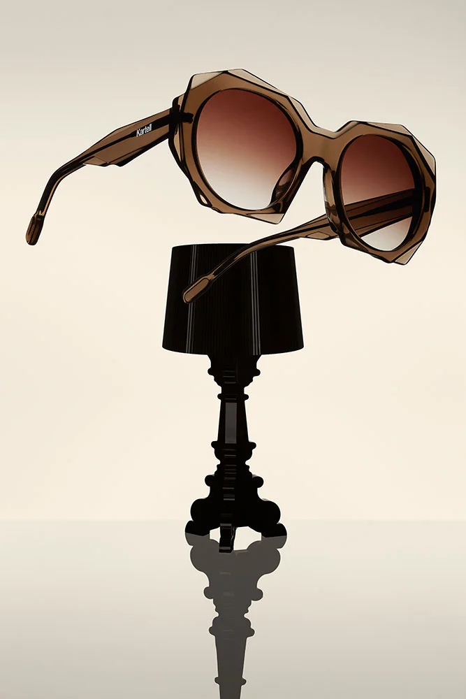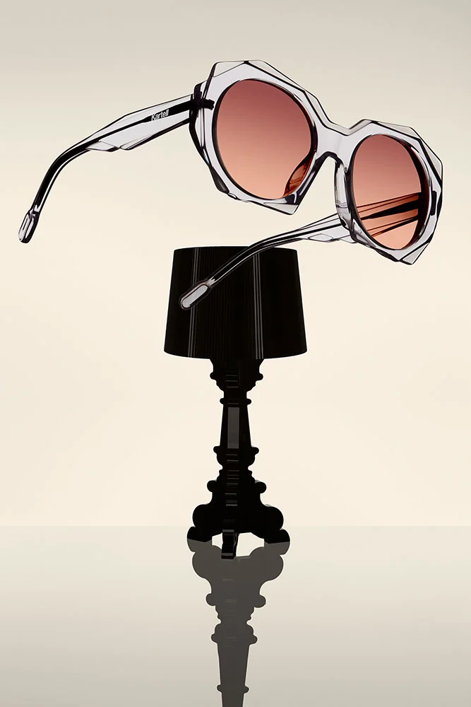 Uno + Uno = Tre รจ la prima idea che ha generato la collezione Kartell Eyewear. Lamina nasce dalla combinazione di due silhouette diverse ma armoniose fuse lโuna nellโaltra per dare vita a un terzo segno grafico che, in un gioco di sovrapposizioni, genera dimensioni multiple a seconda delle angolature di luce e diverse sfumature di colore generate dallโaccostamento dei materiali trasparenti. La contaminazione delle forme e degli spessori rimanda ai piรน iconici prodotti Kartell con un chiaro richiamo alla tecnologia produttiva del brand.